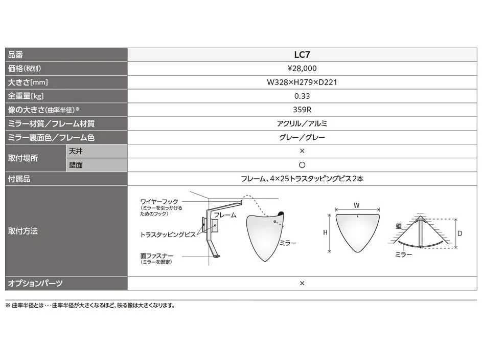 ラミコーナー 品名サイズ価格重量曲率半径LC7W328×H279×D221¥28,0000.33kg359R L字路への設置に特化した防犯鏡 軽量で扱いやすいアクリルミラー アルミフレーム:グレー 直販サイト